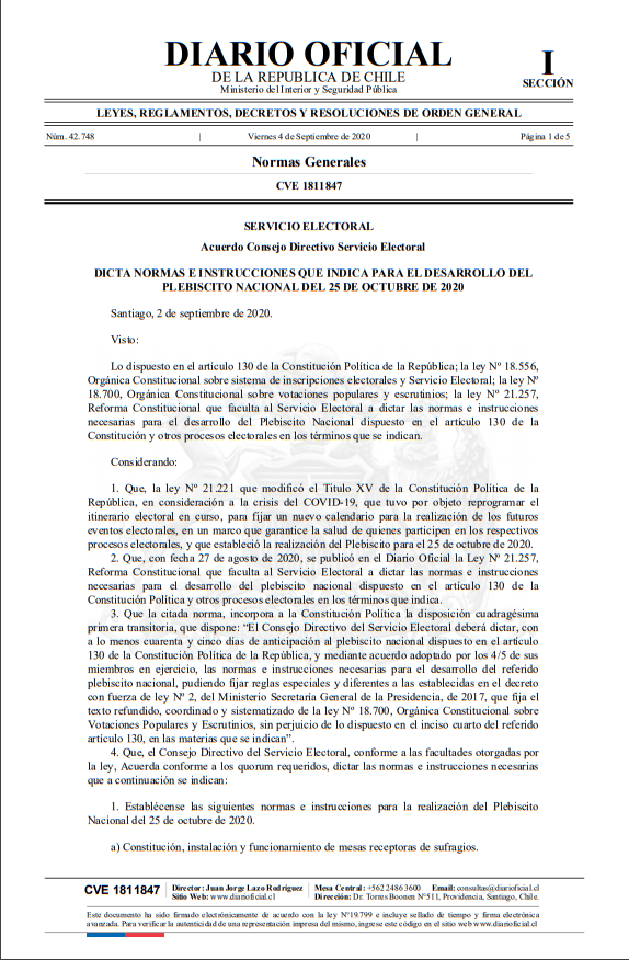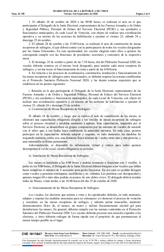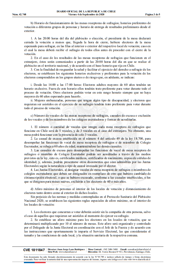 Según la publicación aparecida hoy en el Diario Oficial, las normativas para el proceso constituyente establece que los adultos mayores de 60 años tendrán un horario específico para votar, el cual va desde las 14:00 horas y las 17:00 horas, como también un trato preferente para sufragar.