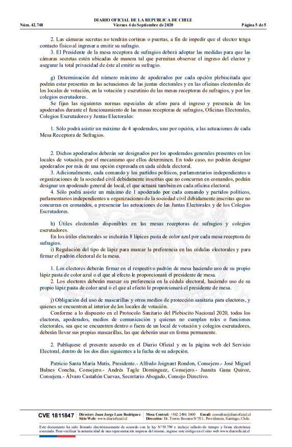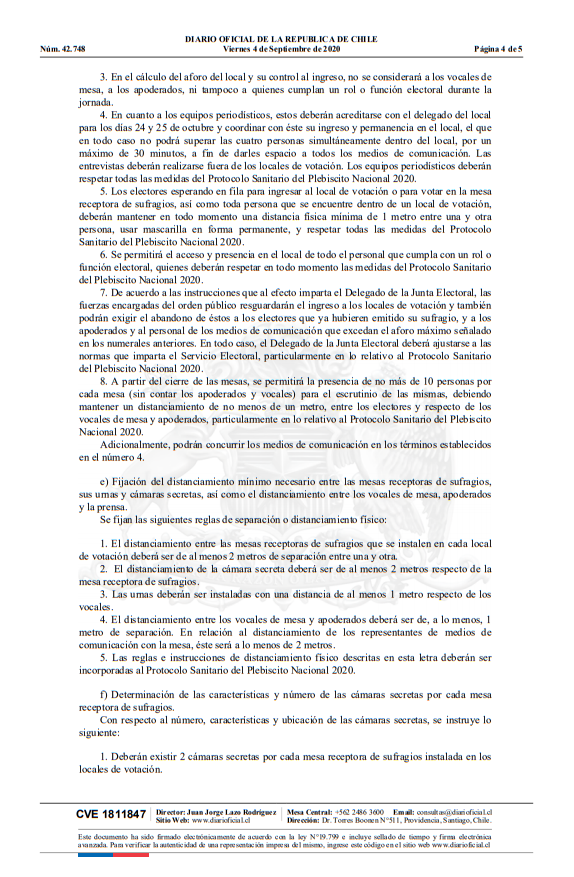 También se establece la presencia de 2 cámaras secretas por cada mesa receptora de sufragios, las cuales “no tendrán cortinas o puertas, a fin de impedir que el elector tenga contacto físico al ingresar a emitir su sufragio”.