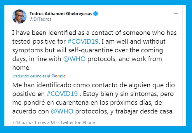 «He sido identificado como contacto de alguien que ha dado positivo por #COVID19. Estoy bien y sin síntomas, pero guardaré cuarentena en los siguientes días en línea con los protocolos de la OMS y trabajaré desde casa», ha anunciado este domingo Tedros en su cuenta personal de Twitter.