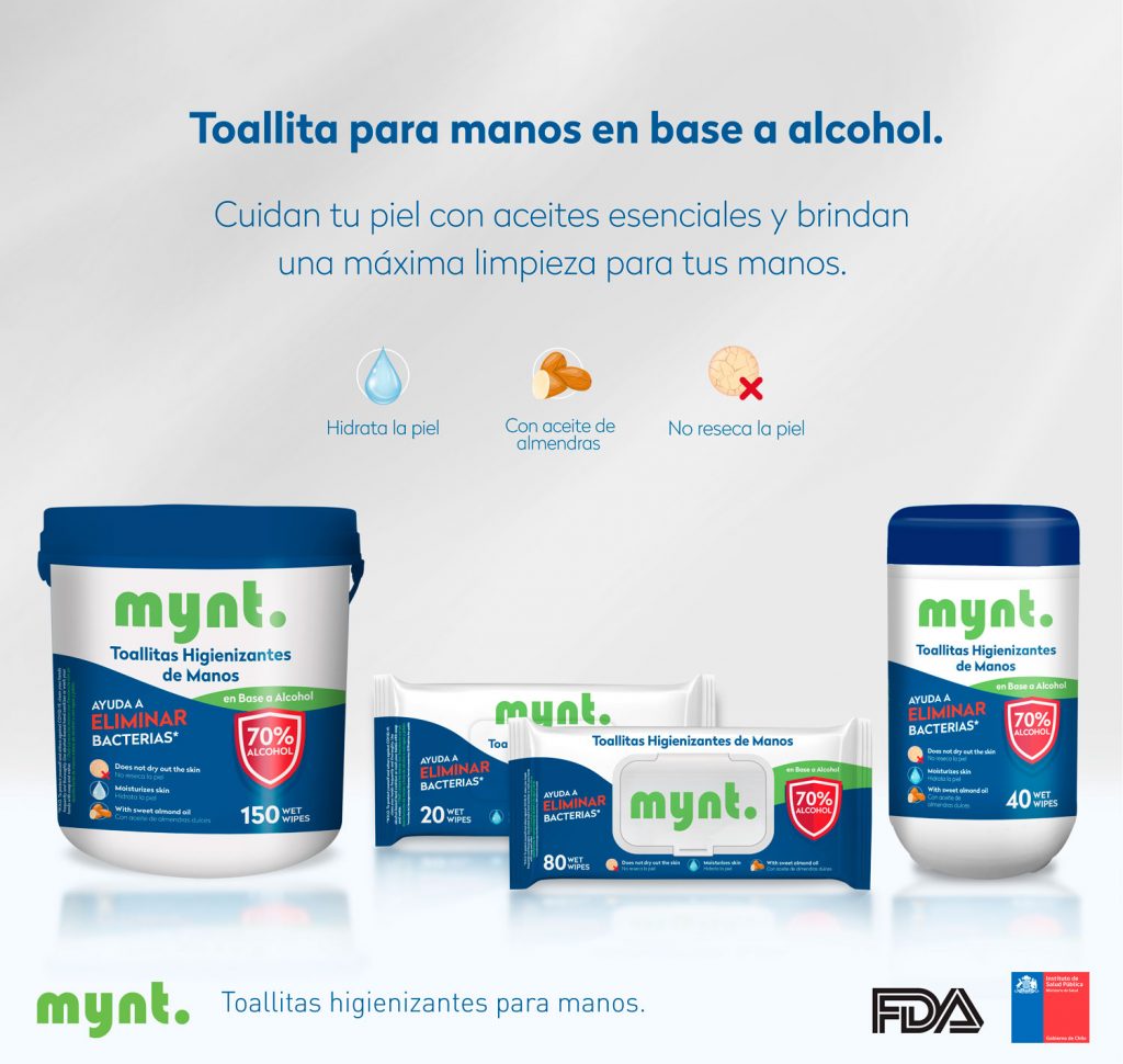 En un momento en que la higiene y limpieza son claves para proteger la salud, ya está en Chile MYNT, marca de toallitas higienizantes formuladas con 70% de alcohol y aceite de almendras, que limpian y ayudan a eliminar virus y bacterias, todo sin dañar tus manos, manteniendo tu piel hidratada y humectada.