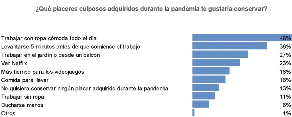 Otras ventajas descubiertas de la nueva normalidad es que el 27% de las personas disfruta trabajar al aire libre en el jardín o en un balcón, y el 23% incluso logra ver Netflix durante horas laborales. Otros deleites preferidos por los empleados incluyen más tiempo para los videojuegos (18%), almuerzos para llevar (16%) e incluso, bañarse con menos frecuencia (8%).