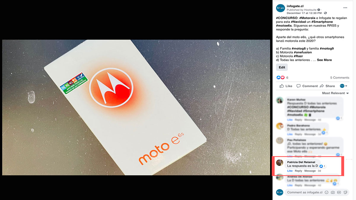 La ganadora es la seguidora de Facebook: Patricia del Retamal, quien participó junto a un centenar de personas. Ella se lleva este maravilloso equipo de Motorola como regalo Navideño….!