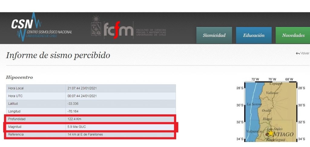 El epicentro estaría ubicado a 11 kilómetros al este de Farellones, Región Metropolitana, a 122 kilómetros de profundidad.