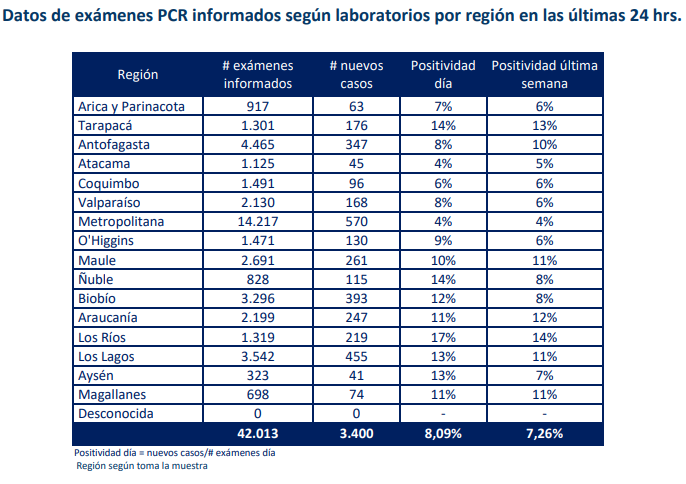 Lo anterior, sobre la base de 42.013 exámenes PCR informados las últimas 24 horas, alcanzando a la fecha un total de 7.366.980 analizados a nivel nacional.