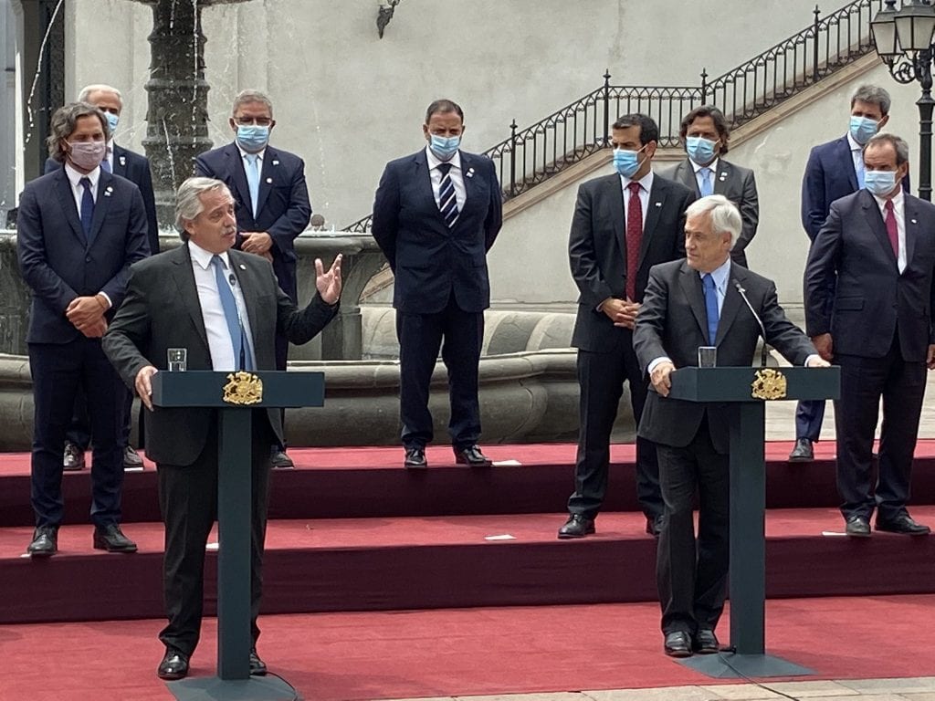 Por su parte, Alberto Fernández manifestó que “mis primeras palabras de gratitud son para el Presidente Piñera, por el buen recibimiento, por la buena predisposición de recibirnos en tiempos difíciles, en tiempos de pandemia”, señalando a continuación que “Argentina y Chile son países hermanos, indisolublemente hermanados, y hermanada tiene que estar toda América Latina en este tiempo que nos toca vivir. Porque en esta pandemia que nos toca vivir a lo que nos ha sometido a que cada uno, a su modo, enfrente lo desconocido, y a veces pienso que si hubiéramos estamos más juntos y más unidos seguramente podríamos haber sobrellevado mejor las cosas”.