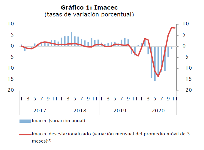 El Imacec de noviembre de 2020 creció 0,3% en comparación con igual mes del año anterior, mientras que la serie desestacionalizada aumentó 1,1% respecto del mes precedente y cayó 0,3% en doce meses. Hay que consignar que el mes registró un día hábil más que noviembre de 2019 y que la cifra es la primera alza desde febrero del año pasado, pero está por debajo de lo esperado.
