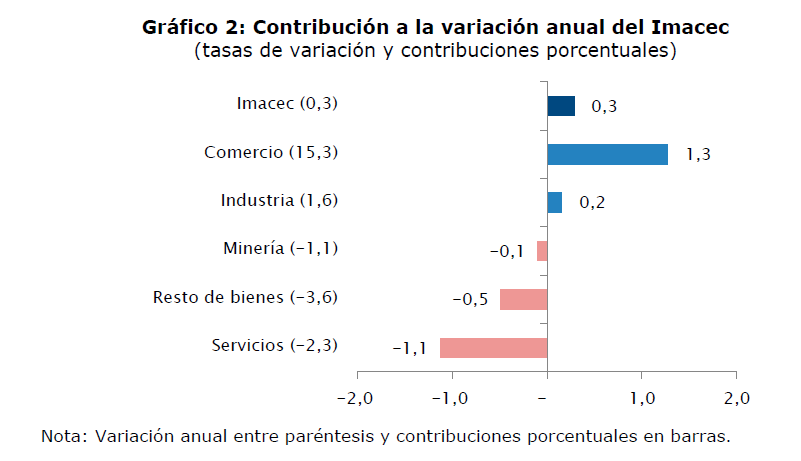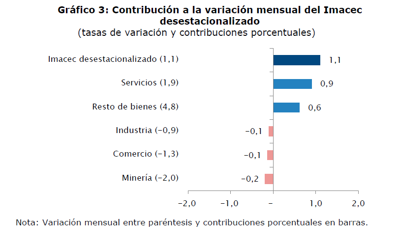 En tanto, el crecimiento del Imacec desestacionalizado fue explicado por el desempeño de los servicios y la producción de bienes, compensado parcialmente por el comercio.