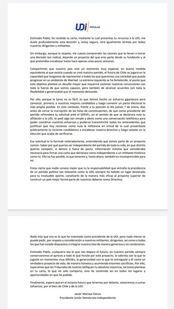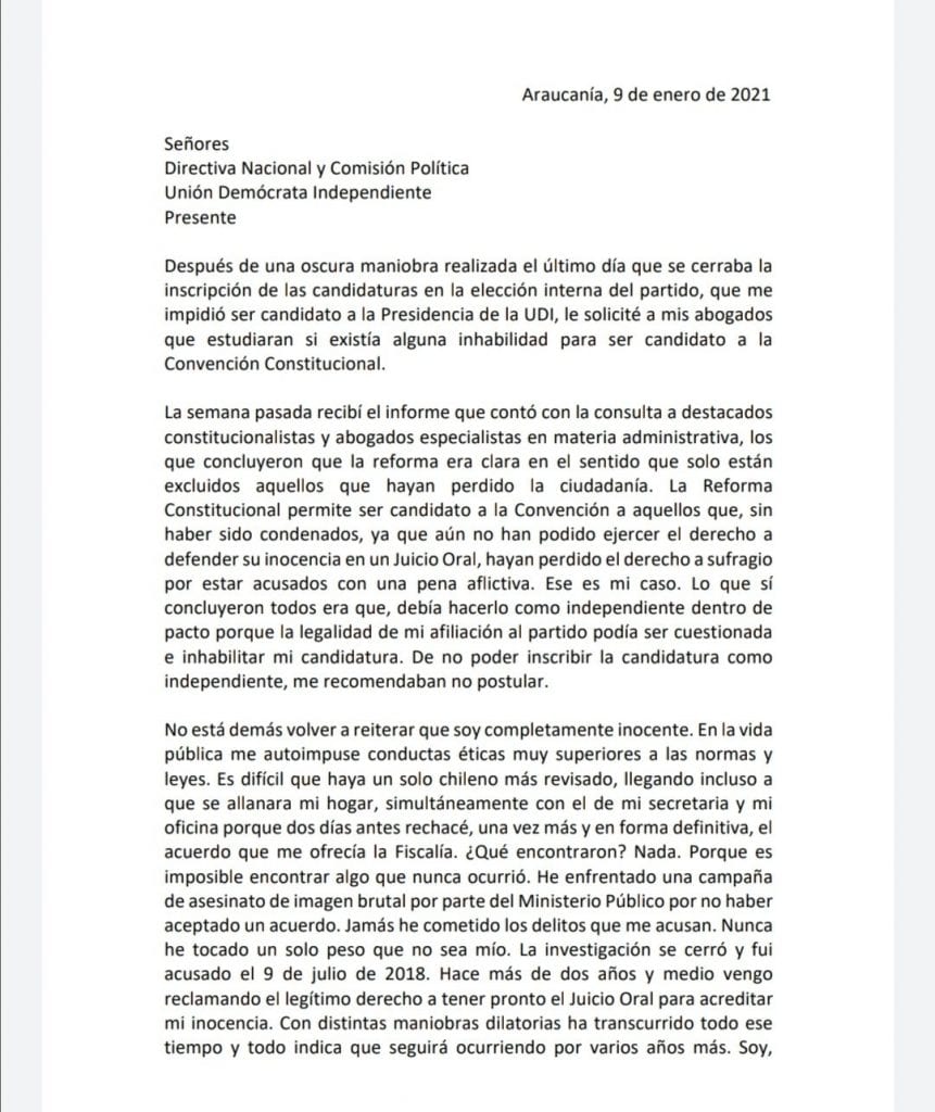 A través de una carta dada a conocer por El Mercurio, el exministro señala que “después de una oscura maniobra realizada el último día que se cerraba la inscripción de las candidaturas en las elección interna del partido, que me impidió ser candidato a la Presidencia de la UDI”.