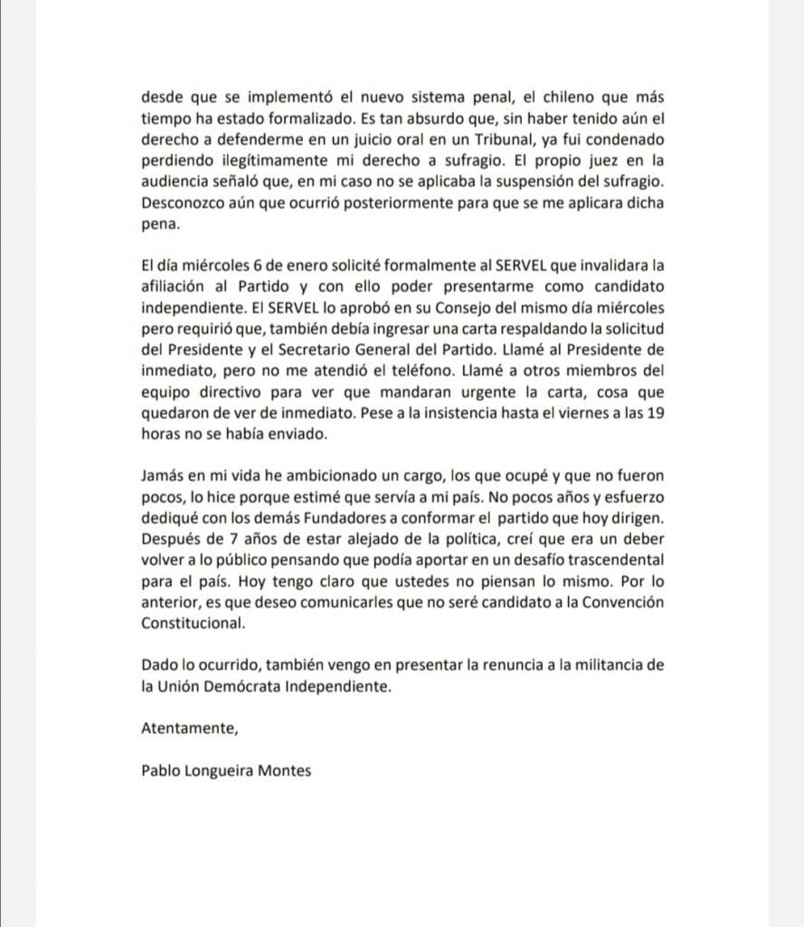 Además, Longueira explica que “jamás en mi vida he ambicionado un cargo, los que ocupé, y que no fueron pocos, lo hice porque estimé que servía a mi país. Después de 7 años alejado de la política, creí que era un deber volver a lo público pensando que podía aportar en un desafío trascendental para el país. Hoy tengo claro que ustedes no piensan lo mismo. Por lo anterior, es que deseo comunicarlos que no seré candidato a la Convención Constitucional. Dado lo ocurrido, también vengo a presentar la renuncia a la militancia de la Unión demócrata Independiente”.