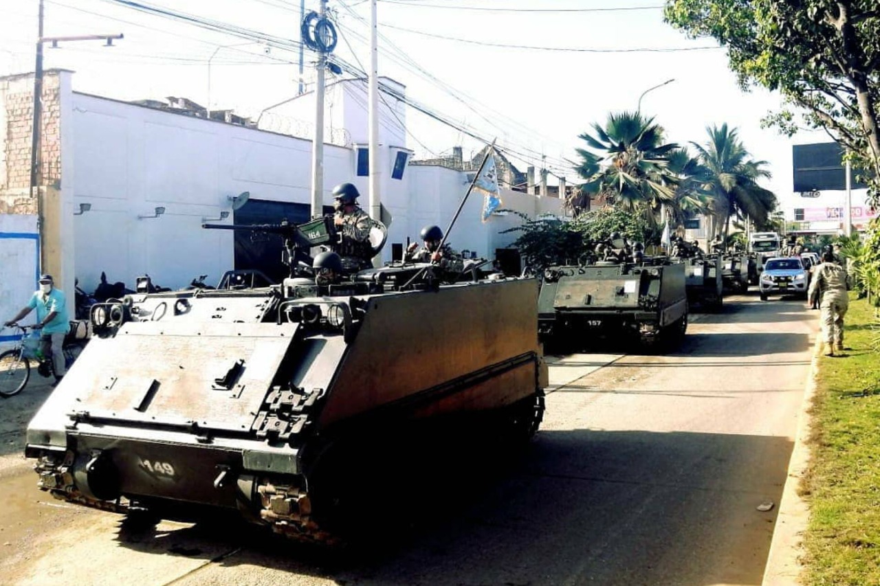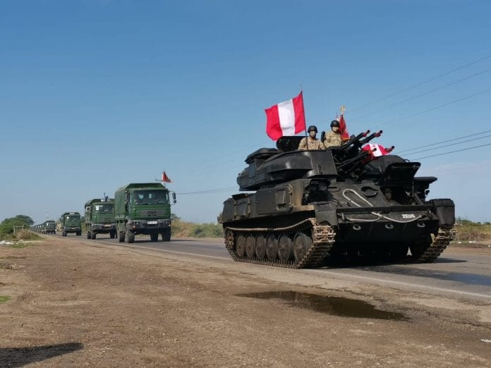 En Tumbes, región en la frontera norte a 1.280 kilómetros de Lima, se pudo observar una columna de vehículos blindados compuesta por tanques, blindados, camiones y vehículos de apoyo desplazándose por las calles, según imágenes de la prensa del vecino país.