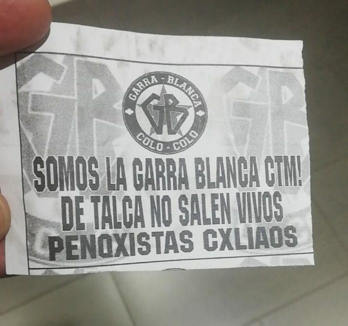 El papel lanzado por los hinchas desde el vehículo señalaba que “somos la Garra Blanca CTM! De Talca no salen vivos penqxistas cxliaos”. Sin embargo, un retén móvil de Carabineros registró la placa patente del auto desde el que se lanzaron los panfletos.