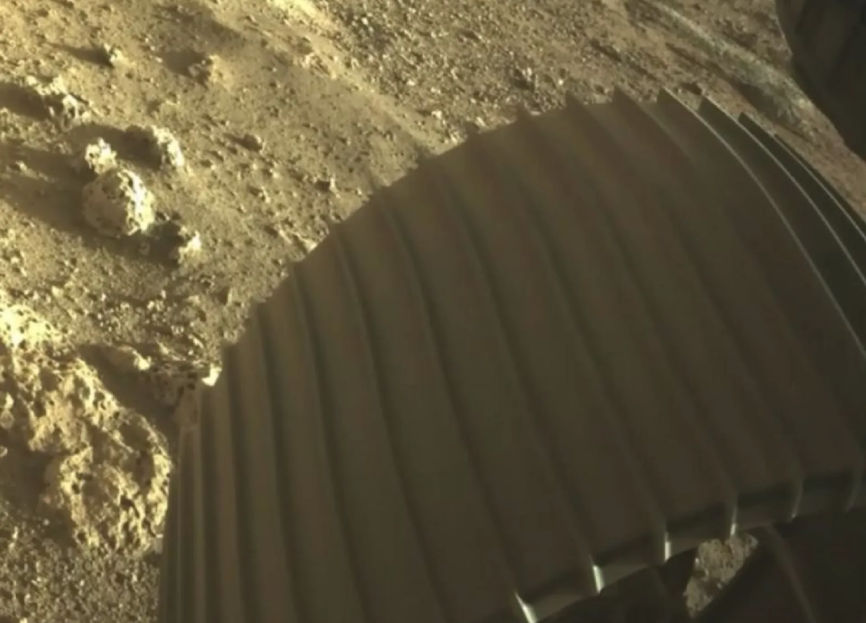 En otra de las imágenes se atraviesan las ruedas del rover, pero también se alcanza a percibir información sobre la superficie geológica de Marte. De acuerdo con científicos de la NASAPerseverance se encuentra en un terreno plano con superficie lisa que contiene rocas volcánicas oscuras. Cerca de él hay otra superficie que tiene rocas con mucho mineral olivino.