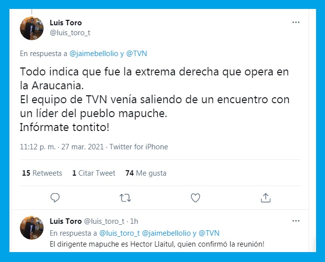 Pero la respuesta contraria la plasmo el ex abogado del Ministerio el Interior, Luis Toro quien le retrucó a Bellolio: «Todo indica que fue la extrema derecha que opera en la Araucanía. El equipo de TVN venía saliendo de un encuentro con un líder del pueblo mapuche. Infórmate tontito!…»