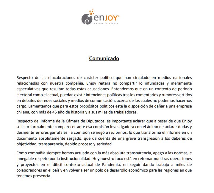 Seguidamente el escrito aborda la investigación emprendida por una comisión de la Cámara de Diputados y su posterior informe -en el que se enumera una serie de acusaciones en contra de la empresa-, explicando que «respecto del informe de la Cámara de Diputados, es importante aclarar que a pesar de que Enjoy solicitó formalmente comparecer ante esa comisión investigadora con el ánimo de aclarar dudas y desmentir errores garrafales, la comisión se negó a recibirnos, lo que transforma el informe en un documento absolutamente sesgado, que da cuenta de una grave transgresión a los deberes de objetividad, transparencia, debido proceso y seriedad».