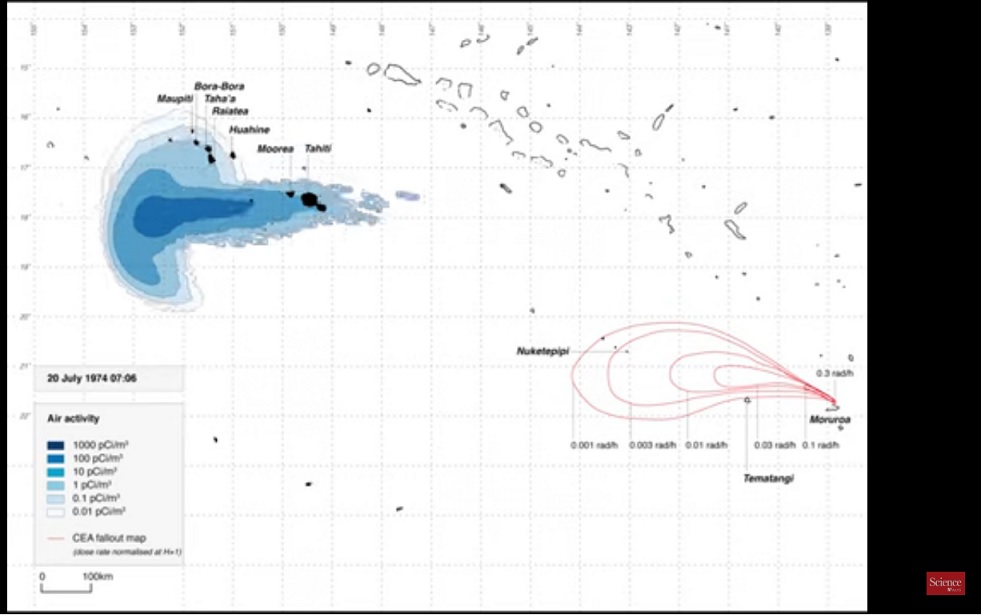 Lo más importante es que los documentos sugieren que una sola prueba en 1974, llamada Centaure, expuso a toda la población de Tahití (87.500 personas en ese momento) a la lluvia radiactiva. Las autoridades francesas detonaron una bomba atómica relativamente pequeña con un rendimiento explosivo equivalente a 4 kilotones de TNT, y los pronósticos meteorológicos predijeron que los vientos deberían llevar lluvia radiactiva hacia el norte. En cambio, el viento sopló hacia el oeste, llevando la pluma directamente sobre Tahití. Una nueva simulación basada en los datos de los documentos muestra cómo la columna de radiación flotaba sobre la isla (vea el video a continuación). CEA estimó que las personas en la isla recibieron una dosis de alrededor de 0,6 mSv.
