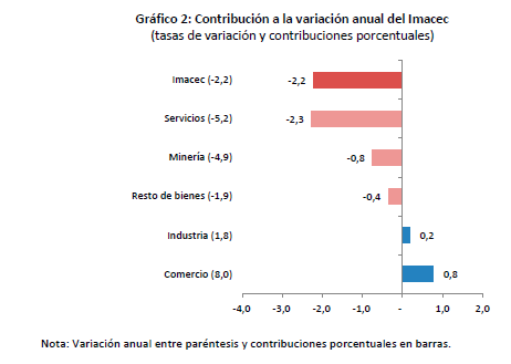 El resultado del Imacec fue explicado por la caída de las actividades de servicios y la producción de bienes, efecto que fue parcialmente compensado por el dinamismo del comercio