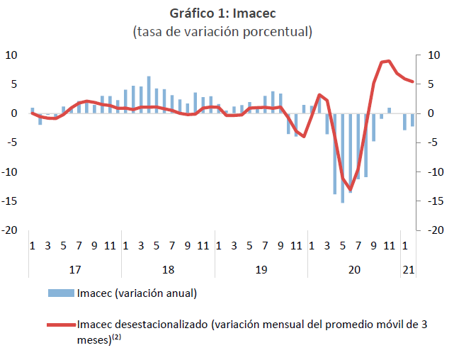 El Banco Central dio a conocer este jueves el Imacec de febrero, el cual muestra una caída de la economía de 2,2% en comparación con igual mes del año anterior.