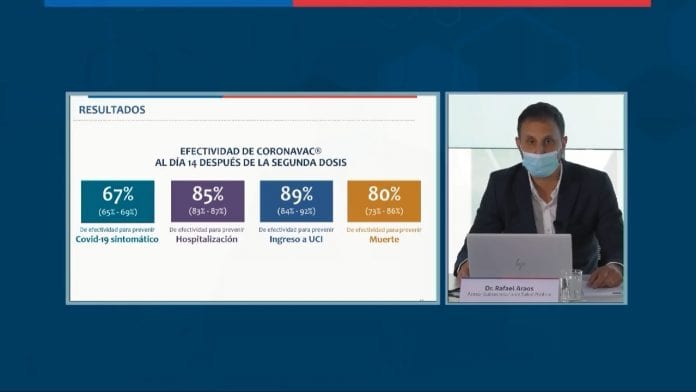 El doctor Rafael Araos, asesor de la subsecretaría de Salud Pública, fue quien leyó el resultado del informe, indicando que la vacuna Sinovac tiene una efectividad de un 67% en prevenir el Covid sintomático, un 85% en prevenir la hospitalización, un 89% en prevenir el ingreso a Unidades de Cuidados Intensivos y un 80% en prevención de fallecimientos. Todos estos resultados son luego de haber recibido la segunda dosis de la inoculación con el medicamento.