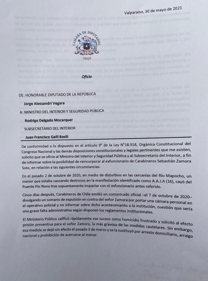 “Antes de investigar los hechos, la prensa, la Fiscalía hablaba de homicidio frustrado, mientras Carabineros lo da de baja por llevar una cámara GoPro personal y no la institucional. Ahora, hechos los peritajes, resulta que al joven que había estado atacando vehículos policiales minutos antes, no lo empuja Zamora, sino que en la persecución para ser detenido, cae”, explicó Alessandri.