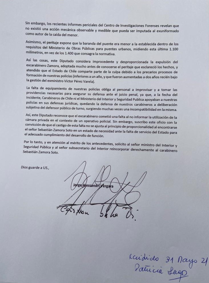 Además, el parlamentario señaló que “estamos pidiendo a Carabineros reconsiderar la medida, no se respetó la presunción de inocencia, por tanto, el carabinero merece unas disculpas y si él lo quiere así, la posibilidad de reintegrarse a su trabajo, a su institución y a su vocación”.