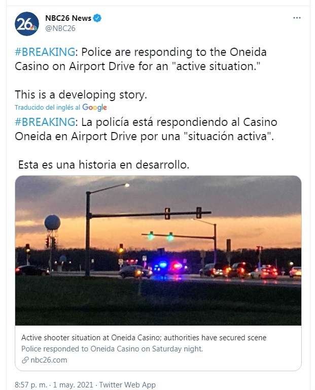 El tiroteo estalló en un comedor del Radisson Inn conectado al Oneida Casino en Ashwaubenon, Wisconsin, en las afueras de Green Bay, dijo. Un portavoz del Oneida dice que las autoridades ya han asegurado la escena. El fiscal general del estado, Josh Kaul, confirmó que la escena está contenida y que ya no existe una amenaza para la comunidad.