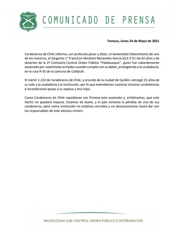 “Carabineros de Chile informa, con profundo pesar y dolor, el lamentable fallecimiento de uno de los nuestros, el Sargento 1° Francisco Abraham Benavides García (Q.E.P.D) de 42 años y de dotación de la 2da Comisaría Control Orden Público “Pailahueque”, quien fue cobardemente asesinado por violentistas armados cuando cumplía con su deber, protegiendo a la ciudadanía, en la ruta R-35 de la comuna de Collipulli”, indica el texto.