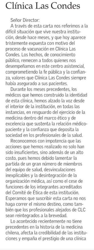 Una carta publicada este sábado en El Mercurio y firmada por 54 médicos de la Clínica Las Condes, dan cuenta de la grave crisis que atraviesa la institución asistencial tras el cuestionado caso de la “tercera dosis” a la que fue sometido el presidente del directorio, Alejandro Gil, acusando también que ese hecho junto con la renuncia y desvinculaciones de funcionarios, ha afectado la credibilidad y confianza entre los pacientes y la ciudadanía.