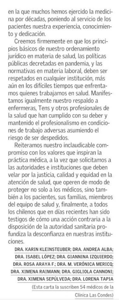 Los facultativos también apuntan que las políticas de salud decretadas en pandemia como las normativas laborales “deben ser respetadas en cualquier institución, más aún en los difíciles tiempos que enfrentamos quienes trabajamos en salud. Manifestamos igualmente nuestro respaldo a enfermeras, Tens y otros profesionales de la salud que han cumplido con su deber y mantenido el profesionalismo en condiciones de trabajo adversas asumiendo el riesgo de ser despedidos”.