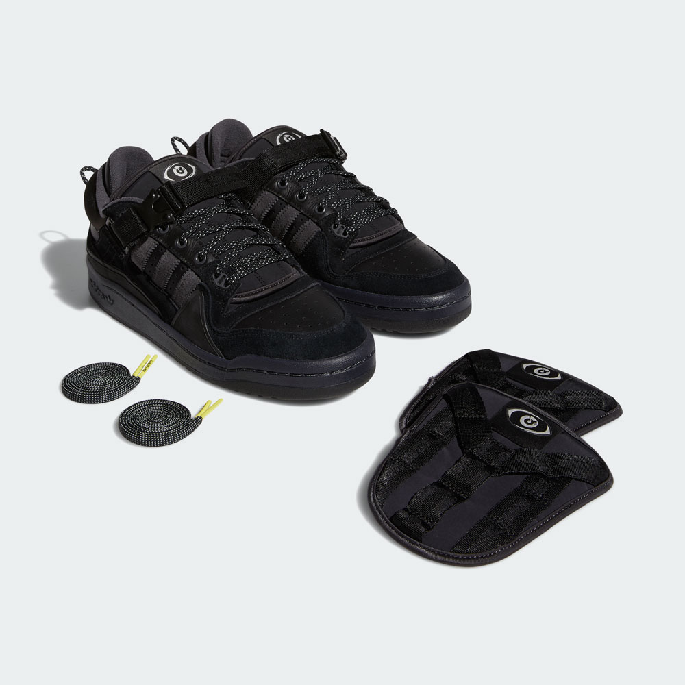 El más reciente modelo de Forum se diseñó para impulsar la expresión creativa y cuenta con un exterior de cuero negro premium, revestimientos de gamuza y un cierre de hebilla. El toque final de esta silueta única son las plantillas con el logo de ambas marcas, los cordones con lunares y el inconfundible logo de Bad Bunny impreso sobre una sección amarilla de la suela.