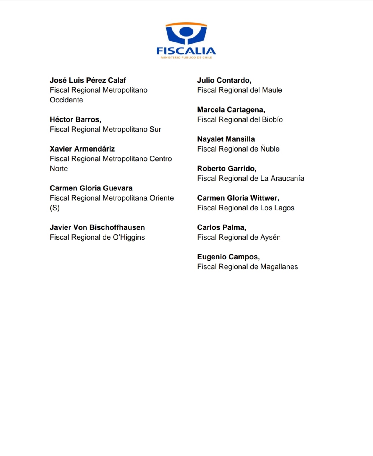 En el comunicado, los persecutores de Arica y Parinacota, Tarapacá, Antofagasta, Atacama, Coquimbo, Valparaíso, Metropolitana, O’Higgins, Maule, Biobío, Ñuble, La Araucanía, Los Lagos, Aysén y Magallanes exponen que la Fiscalía “ejerce diariamente su función, sin importar quién o quiénes cometen el delito, sin que existan grupos o personas privilegiadas”.