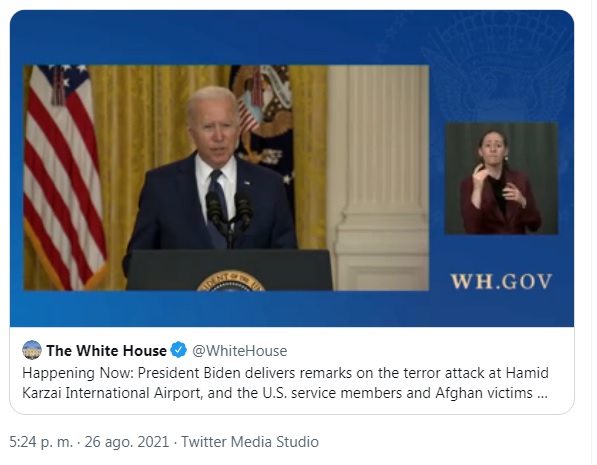 Biden reiteró que Estados Unidos continuará con la evacuación ya que los «terroristas no van a ganar» y se mostró abierto a enviar más tropas para garantizar la misión, pero apuntó que los comandantes no lo habían solicitado por el momento.