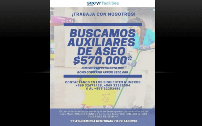 La oferta laboral y que fue viralizado en las RRSS pertenece a la empresa Sacyr Facilities, en el cual se indicaba que “Buscamos Auxiliares de Aseo $570.000” en destacado, pero más abajo se lee “sueldo empresa $370.000, Bono Gobierno Aprox $200.000”.