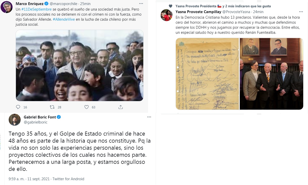 «Tengo 35 años, y el Golpe de Estado criminal de hace 48 años es parte de la historia que nos constituye. Pq la vida no son solo las experiencias personales, sino los proyectos colectivos de los cuales nos hacemos parte. Pertenecemos a una larga posta, y estamos orgulloso de ello», escribió el candidato Gabriel Boric.