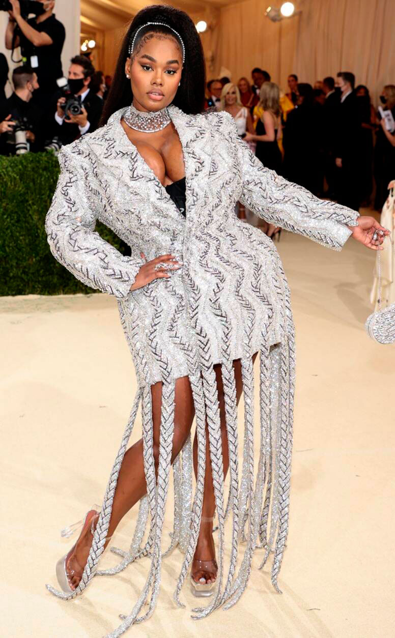 «El vestido bustier sin mangas con corsé de Barbie Ferreira gotea con miles de cristales de Swarovski bordados y perlas que caen en cascada en los flecos y curvas del vestido. El vestido hecho a mano requirió más de 100 horas de meticulosa atención y artesanía. Hay paneles adicionales de perlas drapeadas en el escote y caderas que acentúan las hermosas curvas del cuerpo de Barbie. El escote pronunciado y el vestido sin mangas están adornados con brillo y magia que solo es adecuado para alguien tan mágico y alguien que brilla como brilla Barbie Ferreira «.