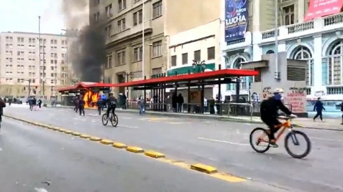 Además, en la esquina Nataniel con Alameda los incidentes derivaron en la quema de un paradero del transporte público, por lo que un carro lanza agua de Carabineros intentó controlar el fuego que consumía la estructura.
