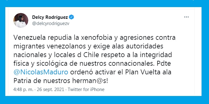 «Venezuela repudia la xenofobia y agresiones contra migrantes venezolanos y exige alas autoridades nacionales y locales d Chile respeto a la integridad física y sicológica de nuestros connacionales. Pdte @NicolasMaduro ordenó activar el Plan Vuelta ala Patria de nuestros herman@s! «
