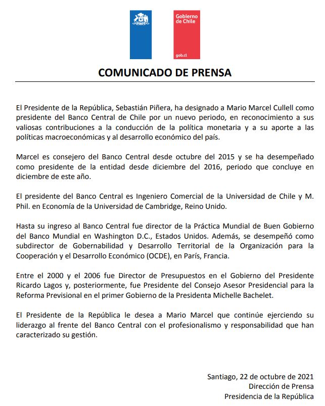 Finalmente, el gobierno agregó en la declaración pública que “el Presidente de la República le desea a Mario Marcel que continúe ejerciendo su liderazgo al frente del Banco Central con el profesionalismo y responsabilidad que han caracterizado su gestión”.