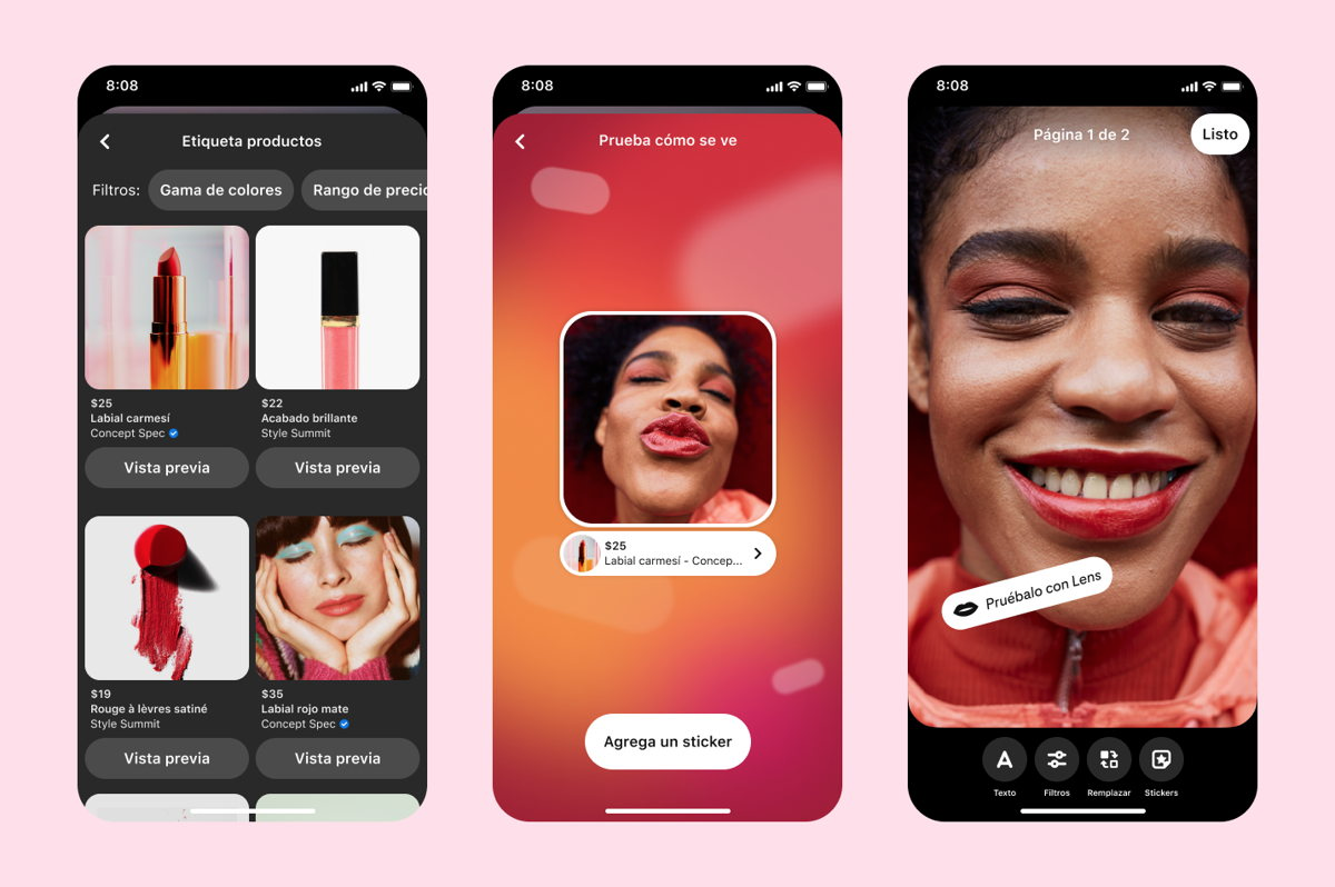 Pinterest continúa sus esfuerzos por hacer que los Idea Pins sean más fáciles de comprar, por lo que ahora los integra con Prueba de RA, su opción de realidad aumentada para probar productos de belleza. Esta nueva función permite a los creadores etiquetar sus Idea Pins con un nuevo sticker Prueba para agregar productos labiales, lo que les permite a los usuarios probarlos y comprarlos directamente desde el Idea Pin. Para acceder a esta nueva función, los creadores pueden seleccionar el sticker Prueba y buscar entre más de 10.000 vínculos de productos habilitados para Prueba con el fin de agregarlos a un Idea Pin.