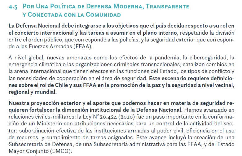 Este domingo la candidata presidencial Yasna Provoste (DC) presento su programa de gobierno y en lo que respecta a la Defensa Naciona (Pág.157 a160), bajo el título: “Por Una Política de Defensa Moderna, Transparente y Conectada con la Comunidad”, define 11 puntos: