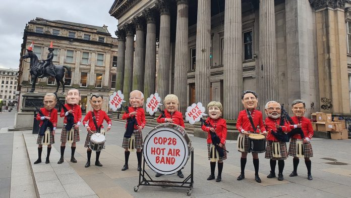 GLASGOW, Escocia (APANSA ) Activistas se disfrazaron el lunes como líderes mundiales tocando en una banda tradicional de gaitas escocesas, como parte de las protestas por la conferencia climática de la ONU en Glasgow.