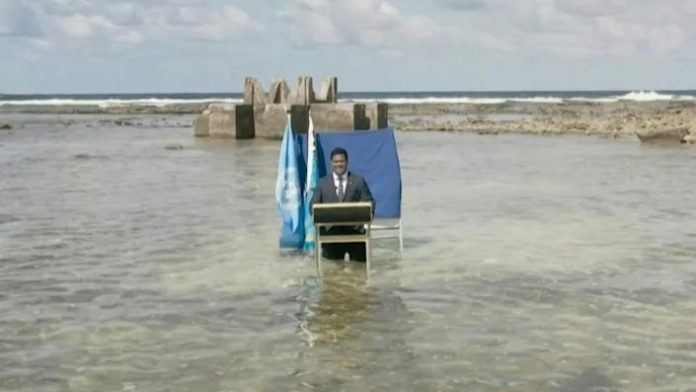El ministro de Relaciones Exteriores de Tuvalu, Simon Kofe, filmó un discurso en video que se mostrará en la COP26, cumbre climática de la ONU, el martes de pie en el agua del mar y suplicando ayuda mientras su país se está hundiendo bajo los crecientes océanos, muestra evidente de los efectos del cambio climático en el planeta