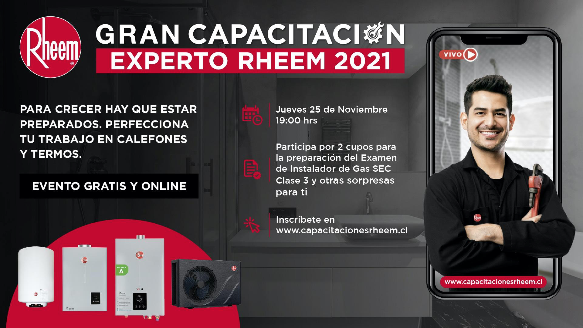 El próximo curso se realizará el 25 de noviembre a las 19:00 horas y se recomienda inscribirse en el link www.capacitacionesrheem.cl. Además, entre quienes se sumen a esta actividad, se sortearán 2 cupos para la preparación del Examen de Instalador de Gas SEC Clase 3 y otras sorpresas.