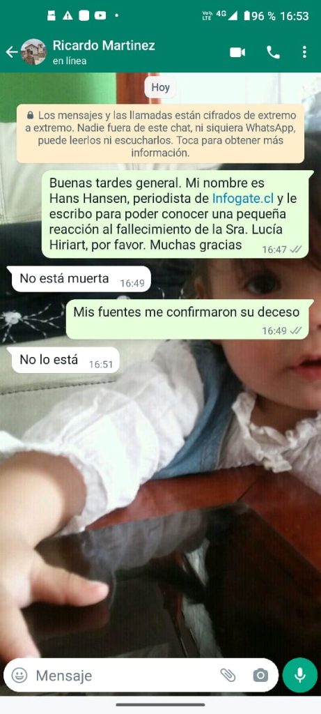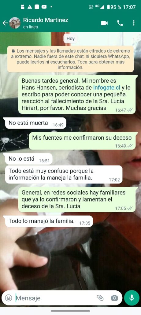 En un intercambio de Whatsapp con el alto oficial militar, al ser consultado por una reacción al deceso de la viuda de Pinochet, Martínez es enfático en negar el fallecimiento, indicando que “NO ESTÁ MUERTA”.
