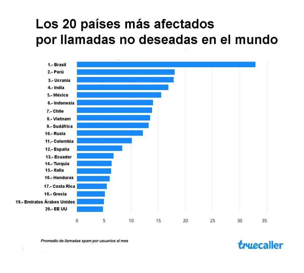 Con respecto al ranking global de países que más llamadas no deseadas reciben en el mundo, Brasil ha conservado su título como el país con más spam del mundo, posición en la que se encuentra por cuarto año consecutivo con 32,9 llamadas de spam por usuario al mes. Le siguen Perú, Ucrania, India y México. El top ten lo completan Indonesia, Chile (en el séptimo lugar), Vietnam, Sudáfrica y Rusia.