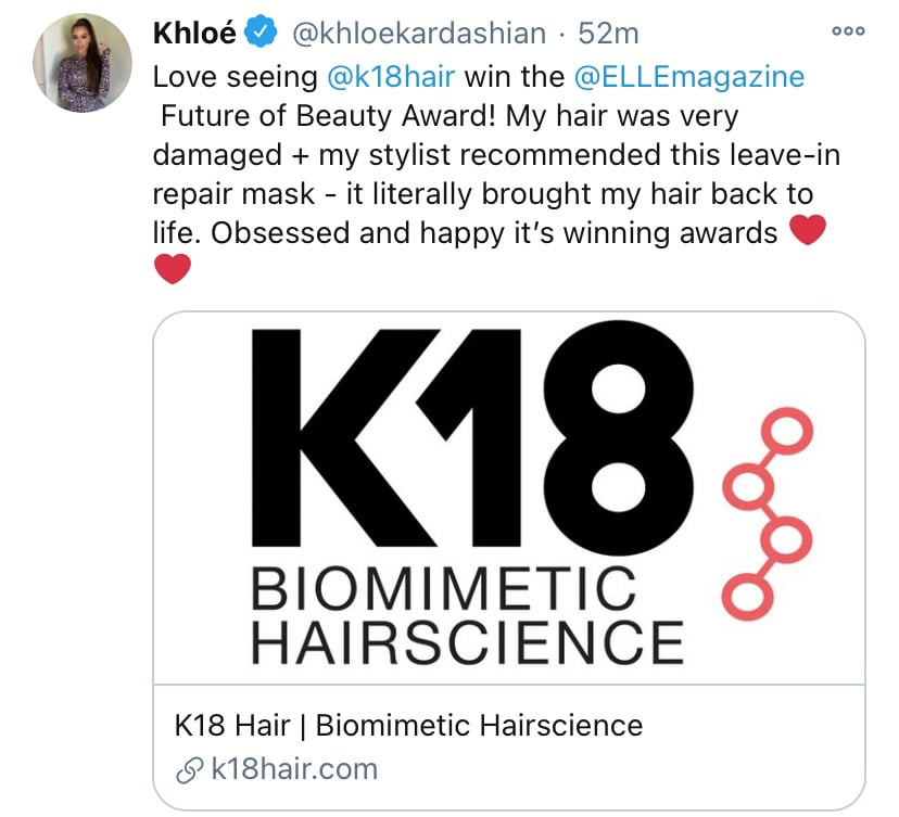 Sin embargo, no fue la única. Khloé Kardashian también se había referido a la capacidad restauradora de K18 a través de sus redes sociales, diciendo que este producto había salvado su cabello, devolviéndole la vida.