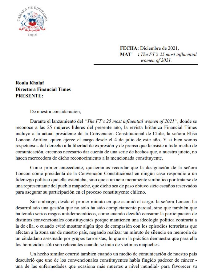 Y es que este viernes, por medio de una carta enviada a la directora del prestigioso medio, Roula Khalaf, los diputados de la UDI Gustavo Sanhueza (senador electo) y Juan Manuel Fuenzalida, le hicieron ver su profunda molestia por esta publicación, ya que en su parecer Loncon «no es merecedora de dicho reconocimiento” justificando ello en que su elección en su actual cargo responde solo a un acto meramente simbólico por tratarse de una representante del pueblo mapuche» y no por un “liderazgo político».
