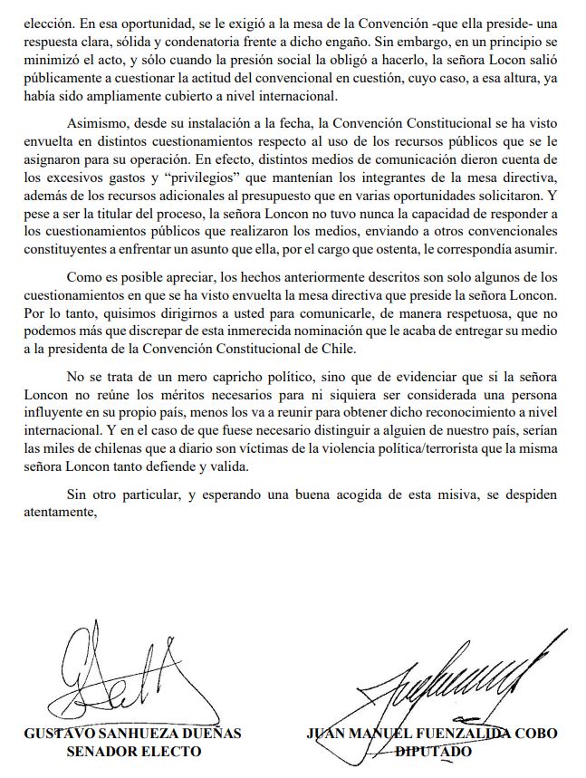 “No se trata de un mero capricho político, sino que de evidenciar que si la señora Loncon no reúne los méritos necesarios para ni siquiera ser considerada una persona influyente en su propio país, menos los va a reunir para obtener dicho reconocimiento a nivel internacional”, dicen sobre el final de su carta.