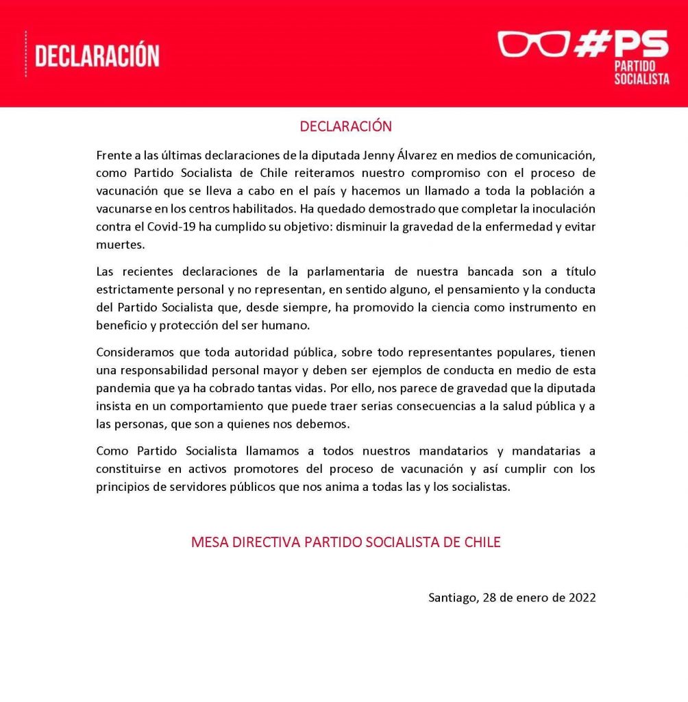 El Partido Socialista salió a reiterar su rechazo a las declaraciones emitidas en las últimas horas por la diputada de la tienda política, Jenny Álvarez, quien insistió en sus posturas contrarias a la vacunación contra el Covid-19, mismas que la han tenido envuelta en permanente polémica luego de que se diera a conocer que no se encontrara vacunada y se contagiara de esta misma enfermedad, gatillando una cuarentena preventiva en toda la bancada PS durante la semana pasada.