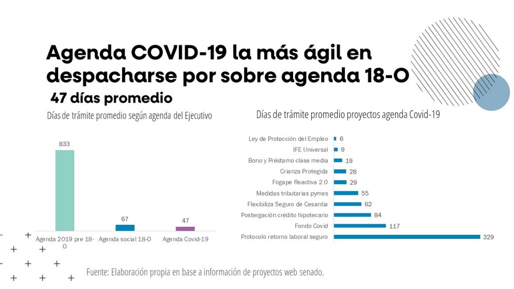 Asimismo, cabe destacar la rapidez de la tramitación de los proyectos, donde la agenda Covid, formada por al menos 64 iniciativas de ley desde marzo de 2020, ha tenido un ritmo de tramitación de 47 días promedio, mayor celeridad que las agendas anteriores. También destaca la celeridad de despacho de otros proyectos como: el Cambio fecha de las elecciones y Plebiscito en un día, la Ley de Protección del Empleo en 6 días, el IFE Universal en 9 días, el Bono a Pymes en 11 días y Medidas Tributarias en 14 días, estas tres últimas gracias a los Acuerdos de Mínimos Comunes liderado por el Gobierno con el Congreso.