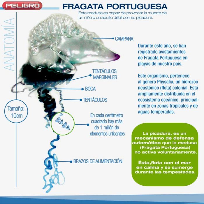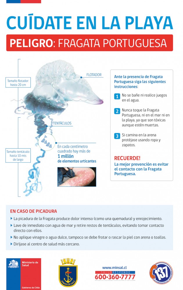 **Fragata portuguesa: es una criatura marina del grupo de las medusas, de distintos tamaños, que solo con el contacto produce una lesión urticarial que puede ser muy grave. En caso de contacto, limpie con agua de mar o una solución de 50% agua 50% de vinagre para lavar la herida y si existen ventosas quitarlas de la piel. Consultar médico para evaluar uso de medicamentos endovenosos. Como prevención, no exponerse al riesgo. Siga las indicaciones de la autoridad local y si observa estas criaturas en la playa, no se acerque y de aviso de inmediato.